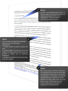 ▪ Corrección de ortotipografía, ortografía y morfosintaxis. ▪ Revisión de redacción, sintaxis y desarrollo argumentativo. ▪ Revisión del uso del léxico jurídico y del lenguaje en general. ▪ Corrección de referencias bibliográficas según normas (APA, MLA, Chicago-Deusto, ISO 690, u otra según se necesite). ▪ Entrega de un sumario de revisión junto con el texto revisado. ▪ Sesión online de entre 30–60 minutos para aclarar dudas del cliente.
